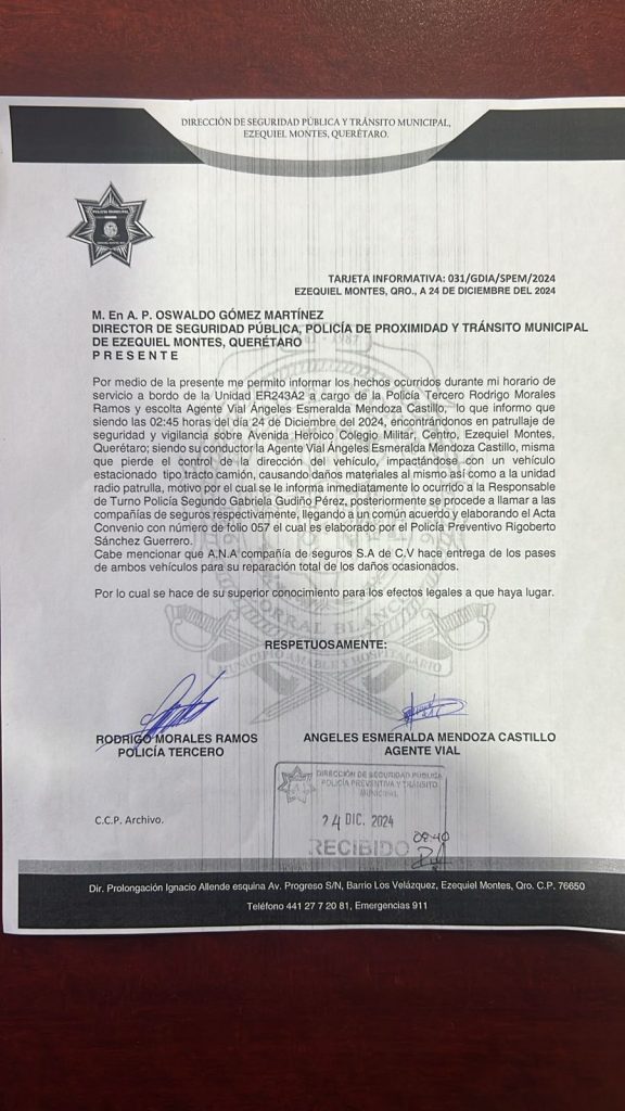 Ezequiel Montes, Qro.,— Durante la madrugada del 24 de diciembre, siendo las 2:45 a.m., se registró un incidente vial en la calle H. Colegio Militar, en el que una agente vial que conducía una unidad de Seguridad Pública Municipal perdió el control del vehículo, impactando contra un camellón y posteriormente colisionando con un tractocamión.