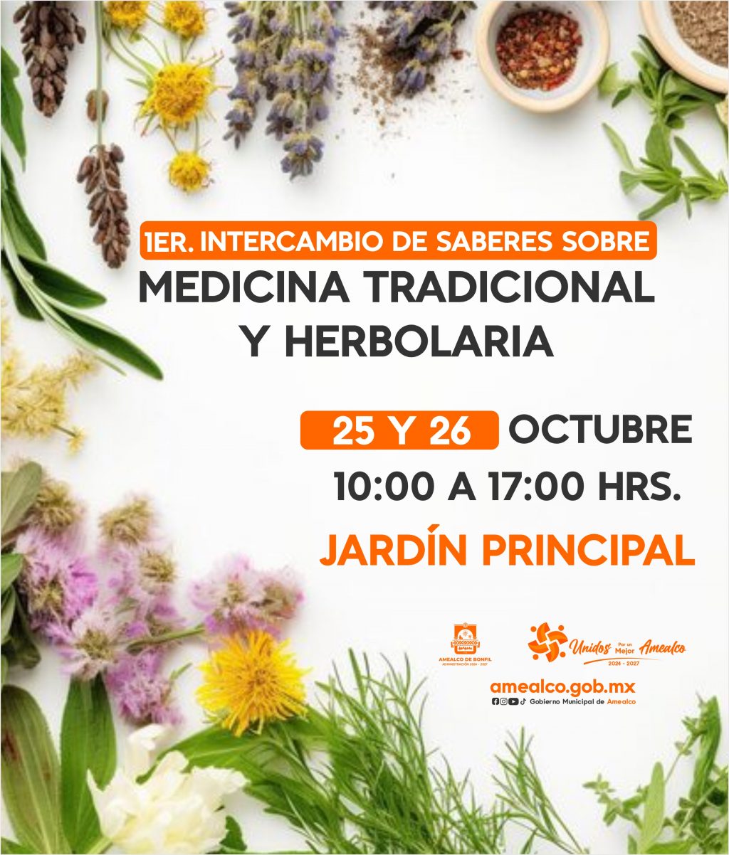 Amealco de Bonfil, Qro.- Con el objetivo de fortalecer la identidad cultural y promover el conocimiento ancestral que ha sido transmitido de generación en generación, el Gobierno Municipal de Amealco llevará a cabo el Primer Intercambio de Saberes sobre Medicina Tradicional y Herbolaria, los días 25 y 26 de octubre, en el Jardín Principal, de 10:00 a 17:00 horas.