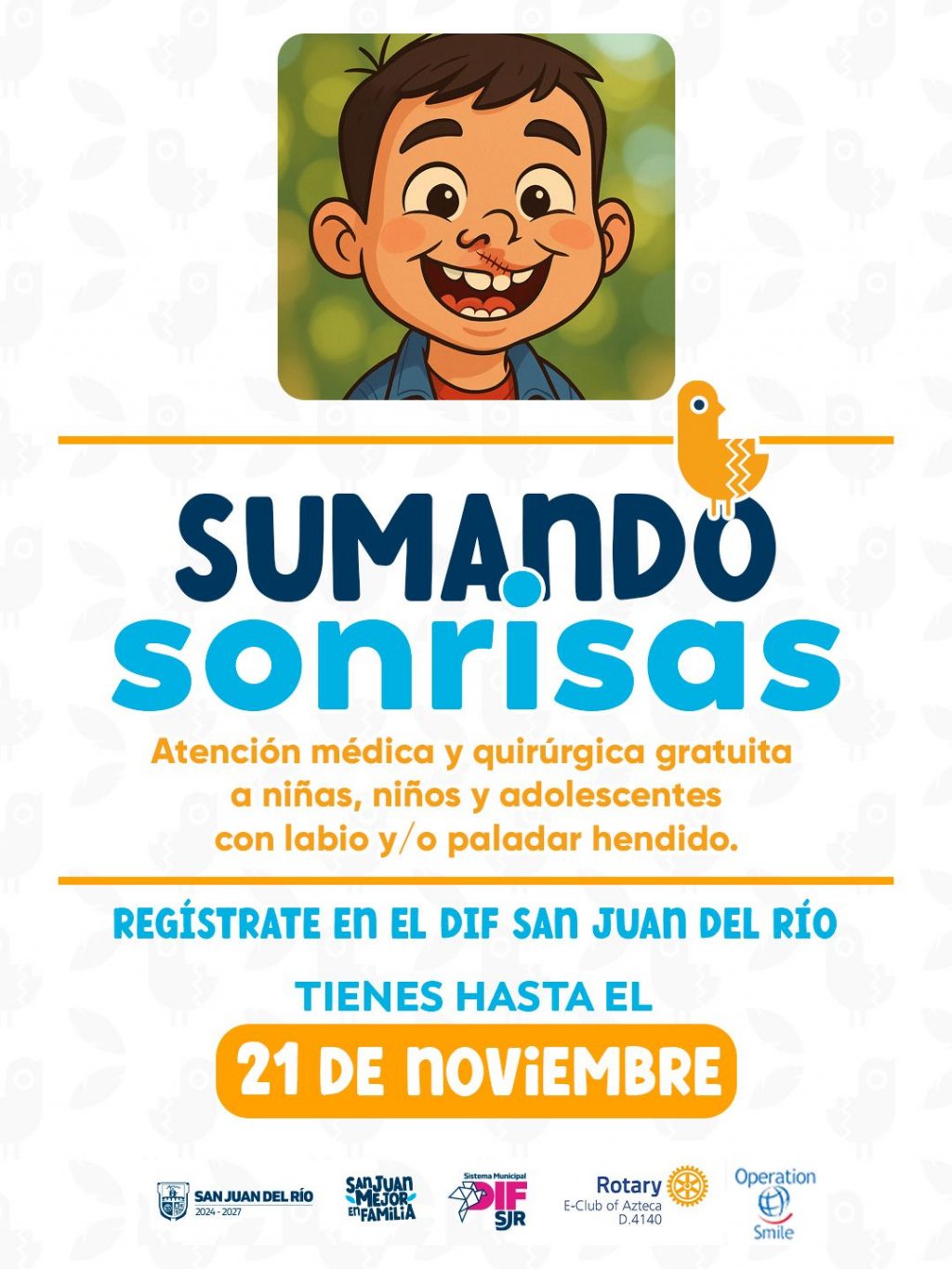 San Juan del Río, Qro.- Con el firme propósito de brindar esperanza y mejorar la calidad de vida de niñas, niños y adolescentes con labio y/o paladar hendido, el Sistema Municipal DIF San Juan del Río, en colaboración con Rotary E-Club de Azteca y la organización internacional Operation Smile, lanzó la campaña “Sumando Sonrisas”, que ofrecerá atención médica y quirúrgica gratuita a quienes lo necesiten.