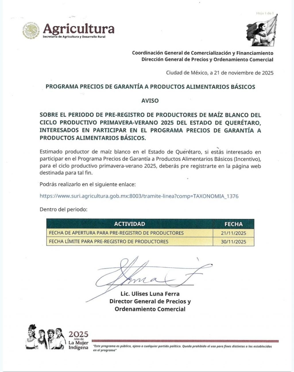 La Secretaría de Agricultura y Desarrollo Rural (SADER) emitió un aviso federal dirigido específicamente a productores de maíz blanco del Estado de Querétaro, informando que ya está habilitado el periodo de pre-registro para integrarse al Programa Precios de Garantía a Productos Alimentarios Básicos (Incentivo Maíz Blanco).