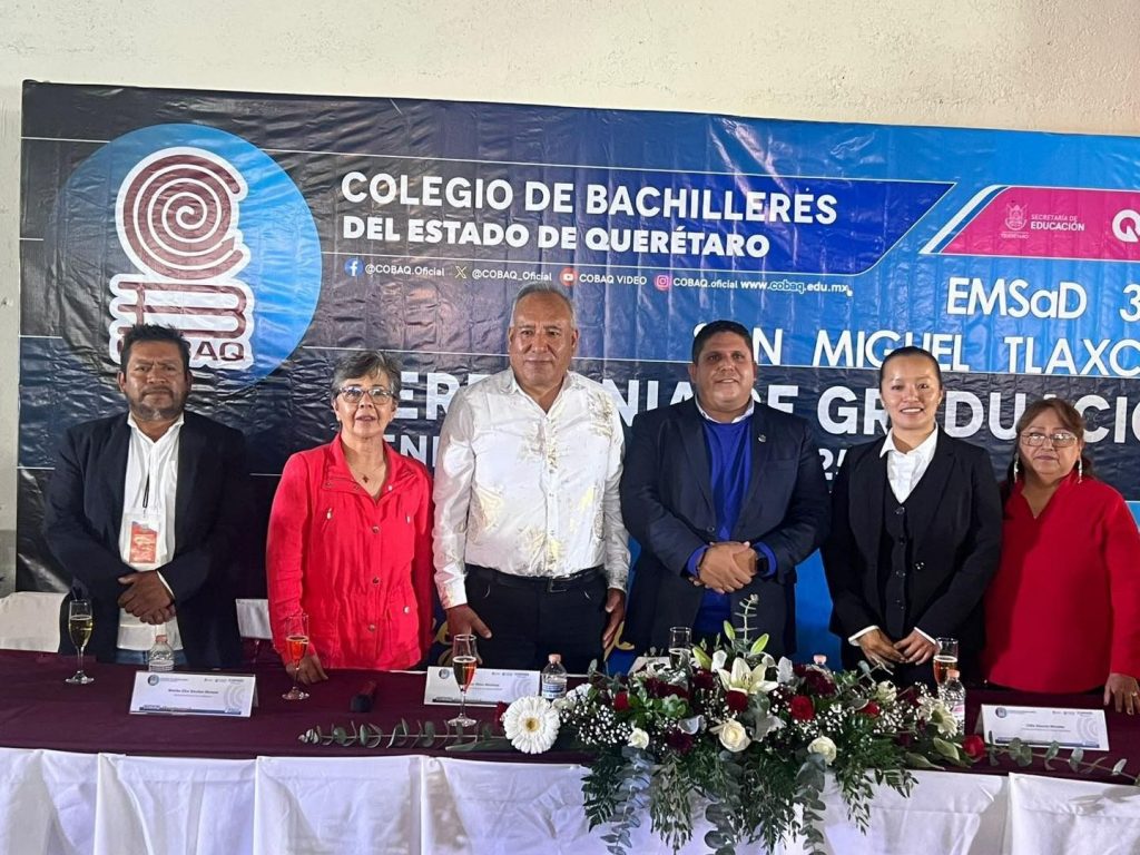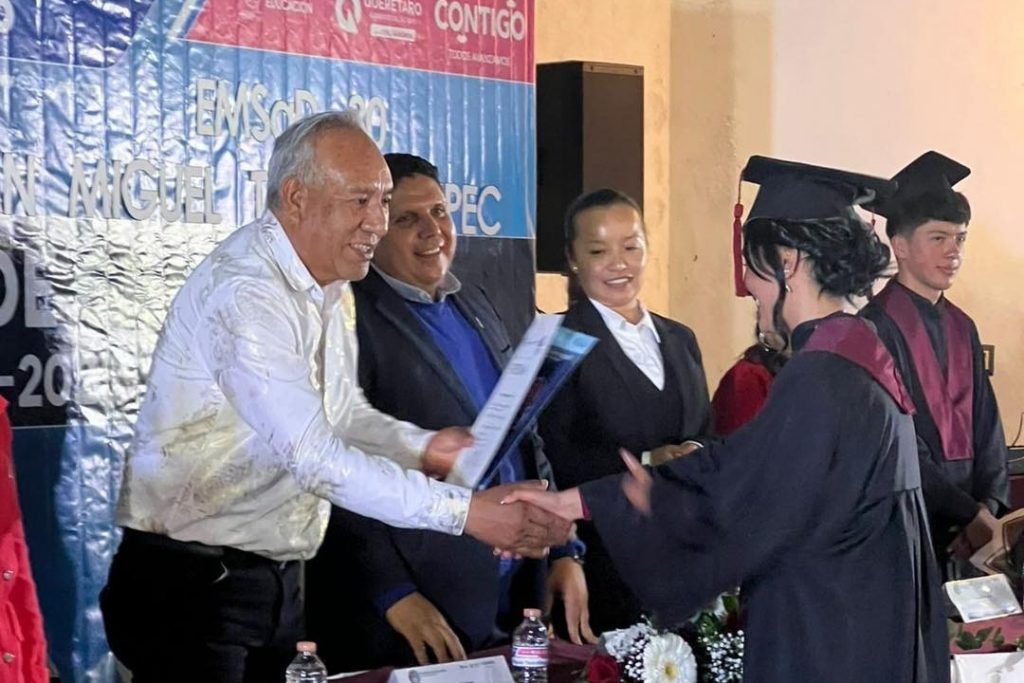 Amealco de Bonfil, Querétaro., a 12 de junio de 2025.- En un evento muy especial que se llevó a cabo en la comunidad de San Miguel Tlaxcaltepec, Amealco, donde 45 jóvenes se graduaron mediante la modalidad de Educación Media Superior a Distancia (EMSAD), donde fueron acompañados como testigo de honor por el presidente municipal Oscar Pérez Martínez, quienes los felicitó y reconoció su esfuerzo de buenos estudiantes, al igual que a sus familiares por este logro educativo orgullo para los amealcenses.