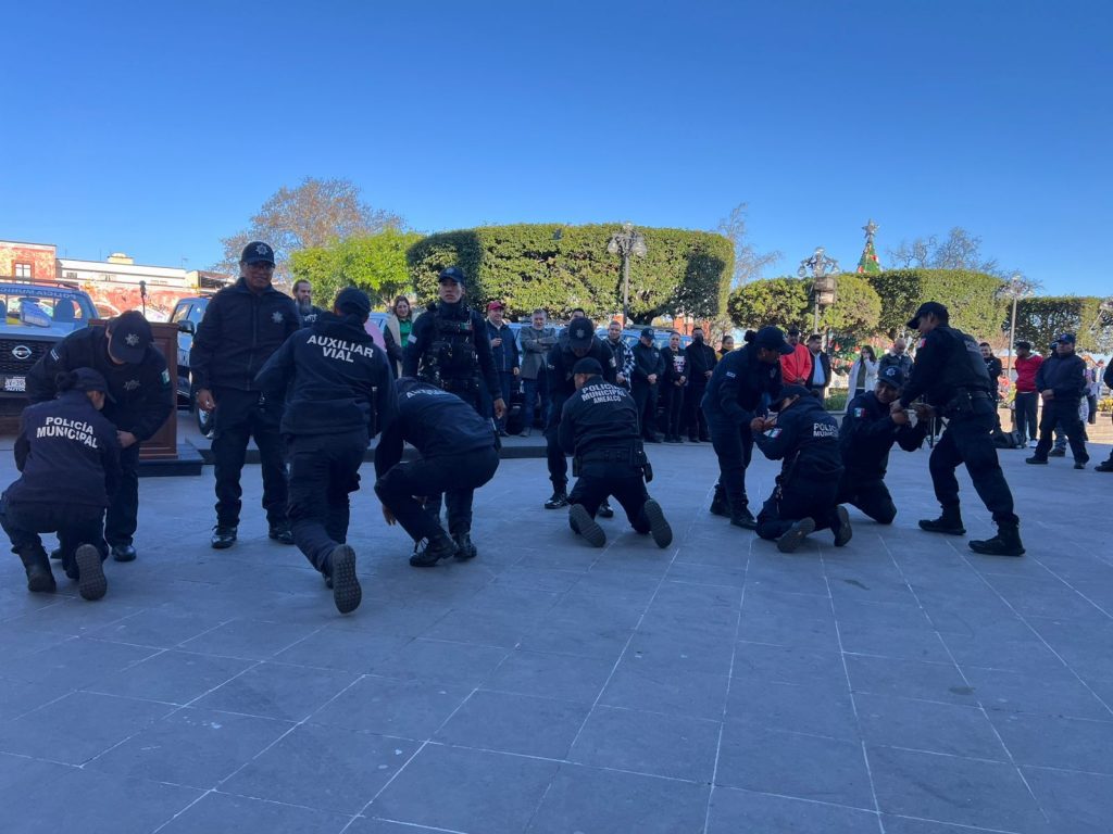 Durante el evento se conto con la demostración del entrenamiento y capacitación que hay recibido los elementos de la Policía Municipal, al igual se realizo la entrega de sus uniformes y tenis deportivos.