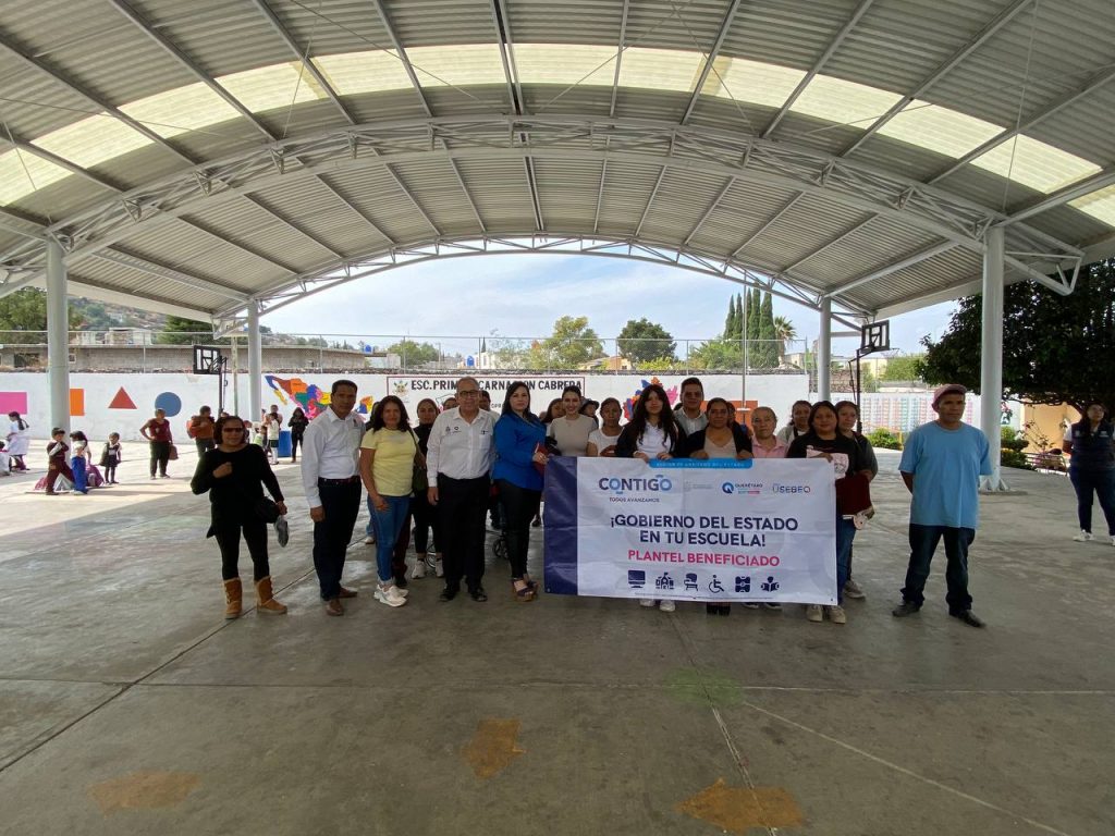 Posteriormente, acudió a la primaria “Encarnación Cabrera/ Prof. Ricardo Rivas Maldonado”, dónde se realizaron trabajos de mejoramiento, que consistieron en impermeabilizado, colocación de cancelería, luminaria, rehabilitación de un módulo sanitario, firme de concreto y techumbre, que beneficia a 795 alumnos.