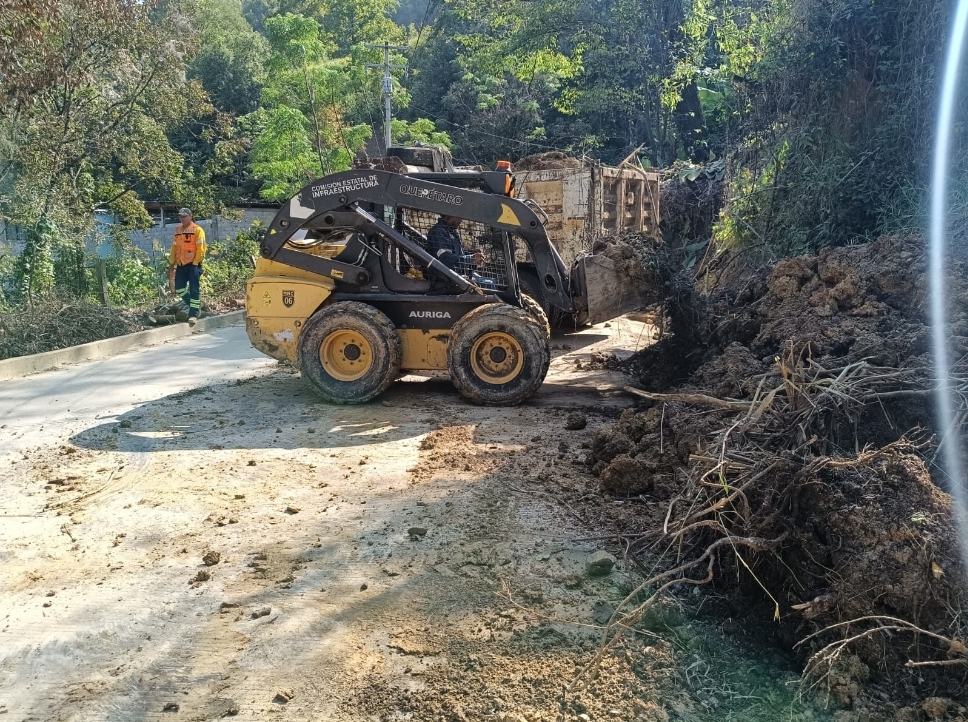 La Comisión Estatal de Infraestructura (CEI), con el apoyo del municipio de Landa de Matamoros, continua con la remoción de piedras, lodo y demás material, tras los recientes derrumbes en caminos de la demarcación, principalmente en el tramo entre las localidades de Río Verdito y Agua Zarca