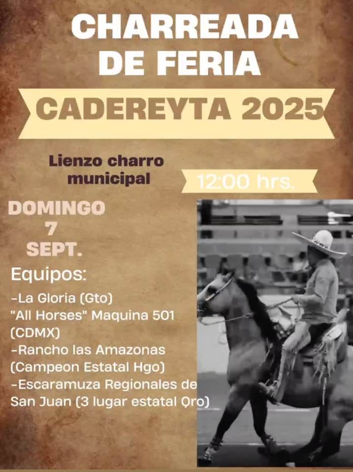 El Lienzo charro Municipal de Cadereyta de Montes se vestirá de gala en la gran competencia charra de lujo dentro de la Feria “Cadereyta 2025” donde se enfrentarán los potentes equipos La Gloria (Gto), “All Horses” Máquina 501 (CDMX) y Rancho Las Amazonas (Campeón estatal de Hgo.) y el mayor atractivo la actuación de la Escaramuza Charra Regionales de San Juan del Río, ganadoras del tercer lugar del estatal de Querétaro, este próximo domingo 7 de septiembre.