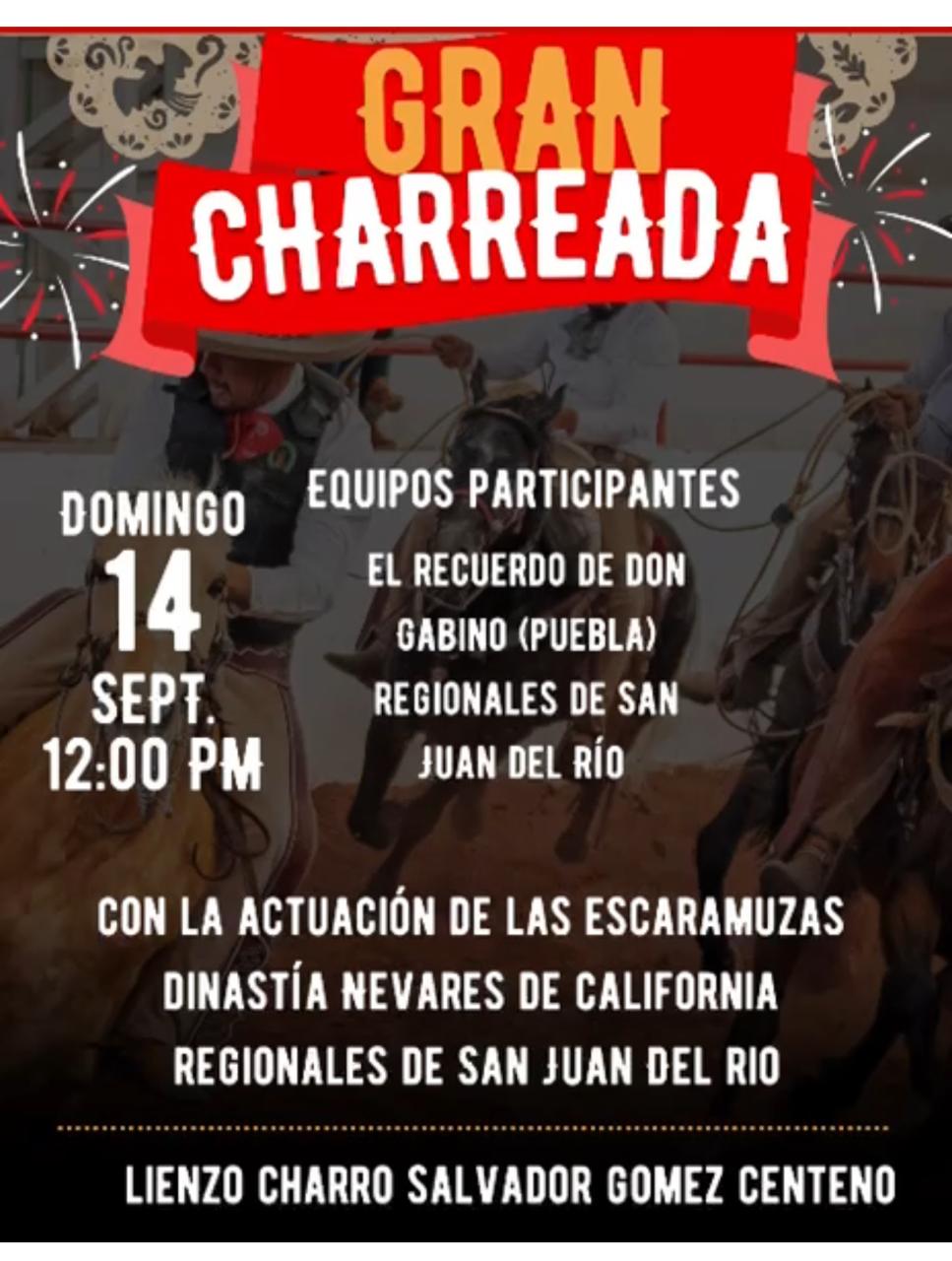 El Lienzo charro “Salvador Gómez Centeno” se vestirá de gala el 14 de septiembre en el meritito Día del Charro, además de recordar el cumpleaños de quien fue el más grande pilar de la charrería en San Juan del Río, me refiero a Don Gabriel Valenzuela Gómez, que en Gloria esté y celebrar los 103 años de charrería de los Regionales de San Juan del Río.,