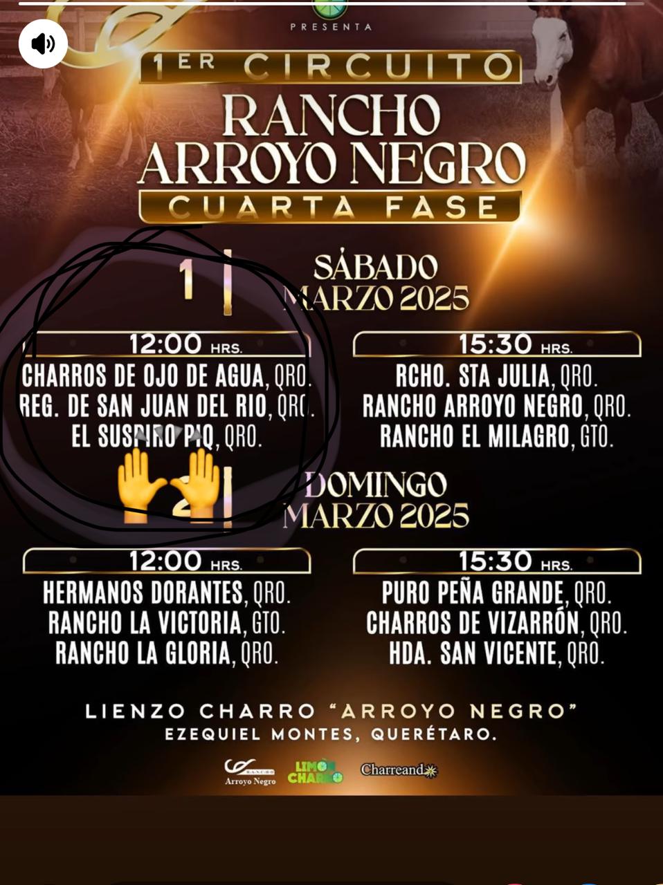 En el mismo lienzo se medirán a las 15:30 horas Rancho Santa Julia, Qro., Rancho Arroyo Negro los anfitrionas y Rancho el Milagro Gto. Esto es el sábado 01 y para el domingo 02 se enfrentarán Hermanos Dorantes, Rancho Victoria Gto. Y Rancho la Gloria, a las 12:00 horas y a las 15:30 horas Puro Peña Grande, Charros de Vizarrón y Hacienda San Vicente.