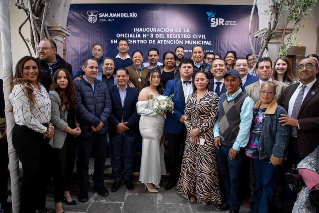 El presidente municipal de San Juan del Río, Roberto Cabrera Valencia, inauguró la Oficialía del Registro Civil número 3 en el Centro de Atención Municipal (CAM) de la Exhacienda de Cerro Gordo, ubicado en la zona Oriente de la demarcación sanjuanense, donde también se llevó a cabo la primera celebración de matrimonio civil.
