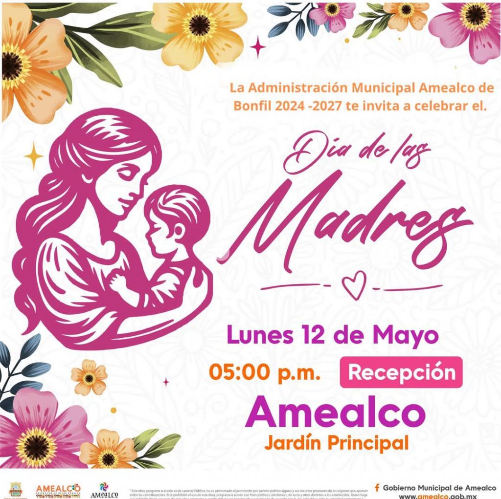 ” ¡Para ustedes, mamás de Amealco! Nos llena de alegría invitar a todas las reinas del hogar a su gran festejo este 12 de mayo a las 5:00 p.m. en el Jardín Principal. Queremos celebrarlas como se merecen: con cariño, alegría y muchas sorpresas. Será una tarde especial para apapachar y consentir a quienes llenan nuestros hogares de amor.”