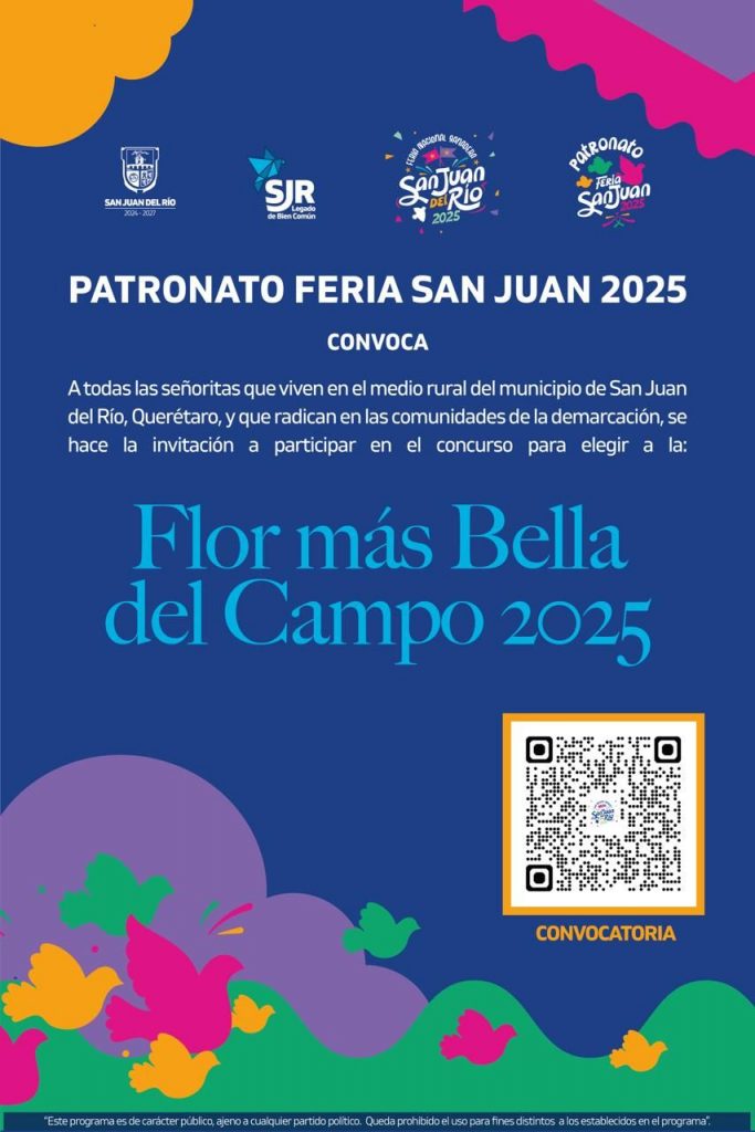 El Patronato de la Feria Nacional Ganadera San Juan del Río 2025 emitió la convocatoria para participar en el concurso de la “Flor Más Bella del Campo”, a través del cual, además de elegir a la ganadora del certamen, se premiará al mejor carro alegórico. El concurso se llevará a cabo el domingo 15 de junio a partir de las 10 horas en la Plaza Independencia, ubicada en el Centro Histórico de la demarcación.