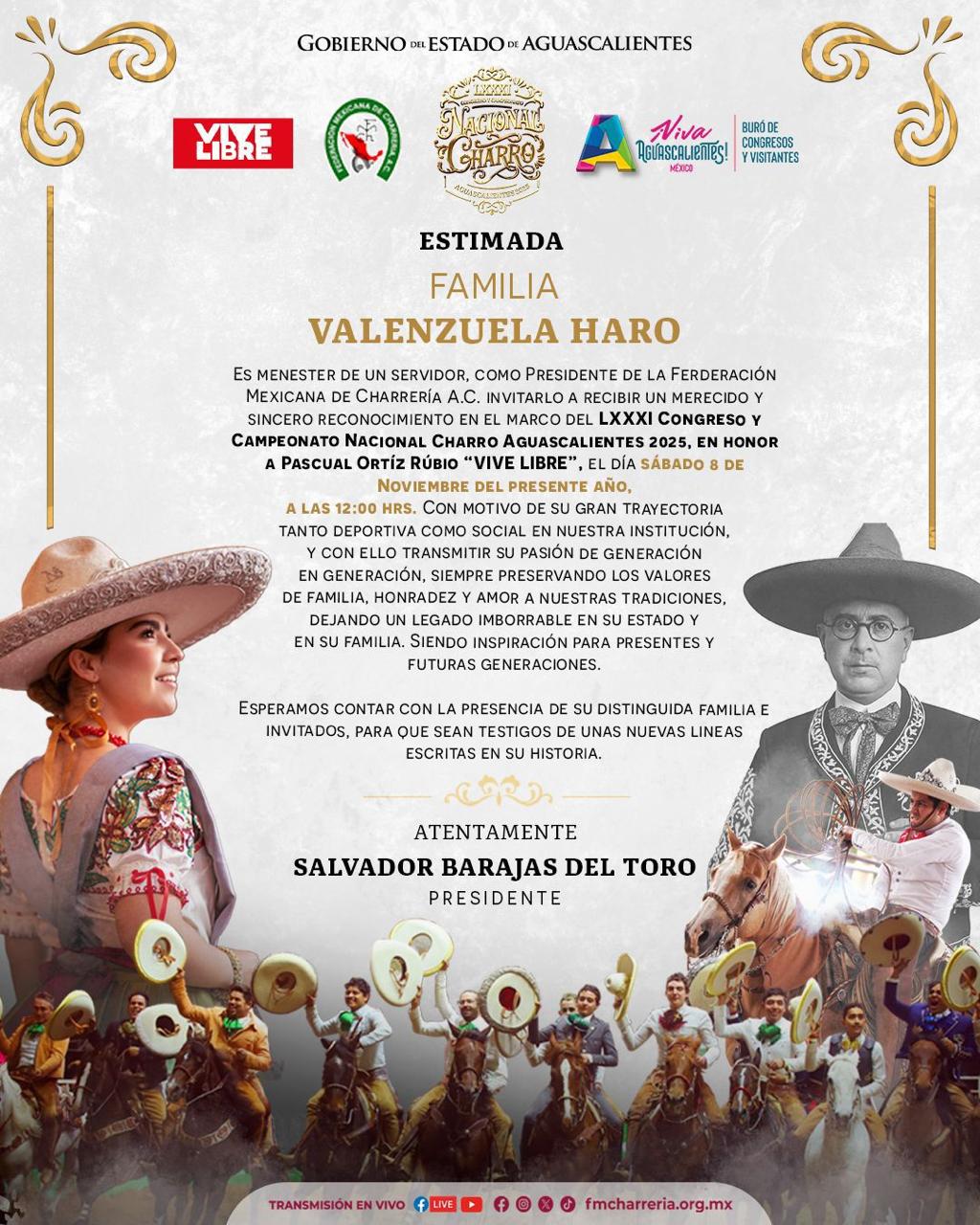 En un emotivo acto de homenaje y tradición, la Federación Mexicana de Charrería A.C., en conjunto con el Gobierno del Estado de Aguascalientes y el Comité Organizador del LXXXI Congreso y Campeonato Nacional Charro “Vive Libre” 2025, rendirá un merecido reconocimiento a la Familia Valenzuela Haro pertenecientes de la Asociación Regional de Charros de San Juan del Río, símbolo de pasión, herencia y compromiso con el arte ecuestre más representativo de México.