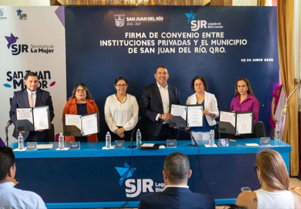 Con la finalidad de establecer las bases de trabajo coordinado, lograr objetivos en beneficio de las mujeres sanjuanenses y sus familias, el presidente municipal de San Juan del Río, Roberto Cabrera Valencia, firmó convenios de colaboración con el Colegio de Abogados Litigantes de Querétaro A.C., Unidad de Medicina Especializada SMA, S.C., Farmacia Prosalud y el Laboratorio de Análisis Clínicos Ángel; mismos que fueron gestionados a través de la Secretaría de la Mujer del municipio, encabezada por Judith Ortiz Monroy.
