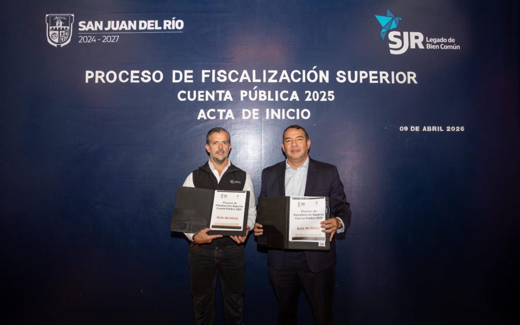 Con la finalidad de dar inicio al proceso de fiscalización de la cuenta pública 2025, el auditor superior del Estado de Querétaro, Francisco Javier Covarrubias Enríquez, y el presidente municipal de San Juan del Río, Roberto Cabrera Valencia, firmaron el Acta de Inicio del Proceso de Fiscalización 2025 en el Salón Presidentes de la Antigua Presidencia Municipal, ubicada en el Centro de la demarcación.