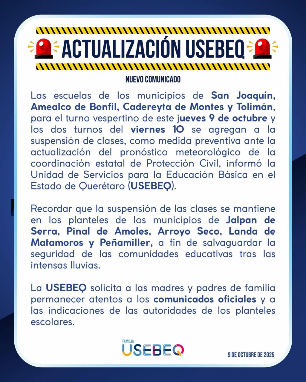De acuerdo con el nuevo comunicado oficial, las escuelas de San Joaquín, Amealco de Bonfil, Cadereyta de Montes y Tolimán suspenderán actividades en ambos turnos del viernes 10.